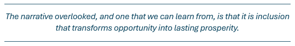The narrative overlooked, and one that we can learn from, is that it is inclusion that transforms opportunity into lasting prosperity. The gold rushes of the 1850’s generated enormous wealth through extraction, but the real impact came from the migrants who arrived to mine, build, and innovate. Chinese, German, Italian, and American arrivals brought skills in engineering, commerce, construction, and finance, helping to build infrastructure, transport networks, and thriving urban centres. Megalogenis notes, “More ships sailed to Melbourne in 1852 than to any other port in the world,” and by the end of the decade, Australians “officially became the richest people in the world, overtaking the British and the Dutch on the measure of GDP per person.” It was not the gold alone, but the combination of resources and the diverse skills and labour of newcomers that created enduring prosperity.